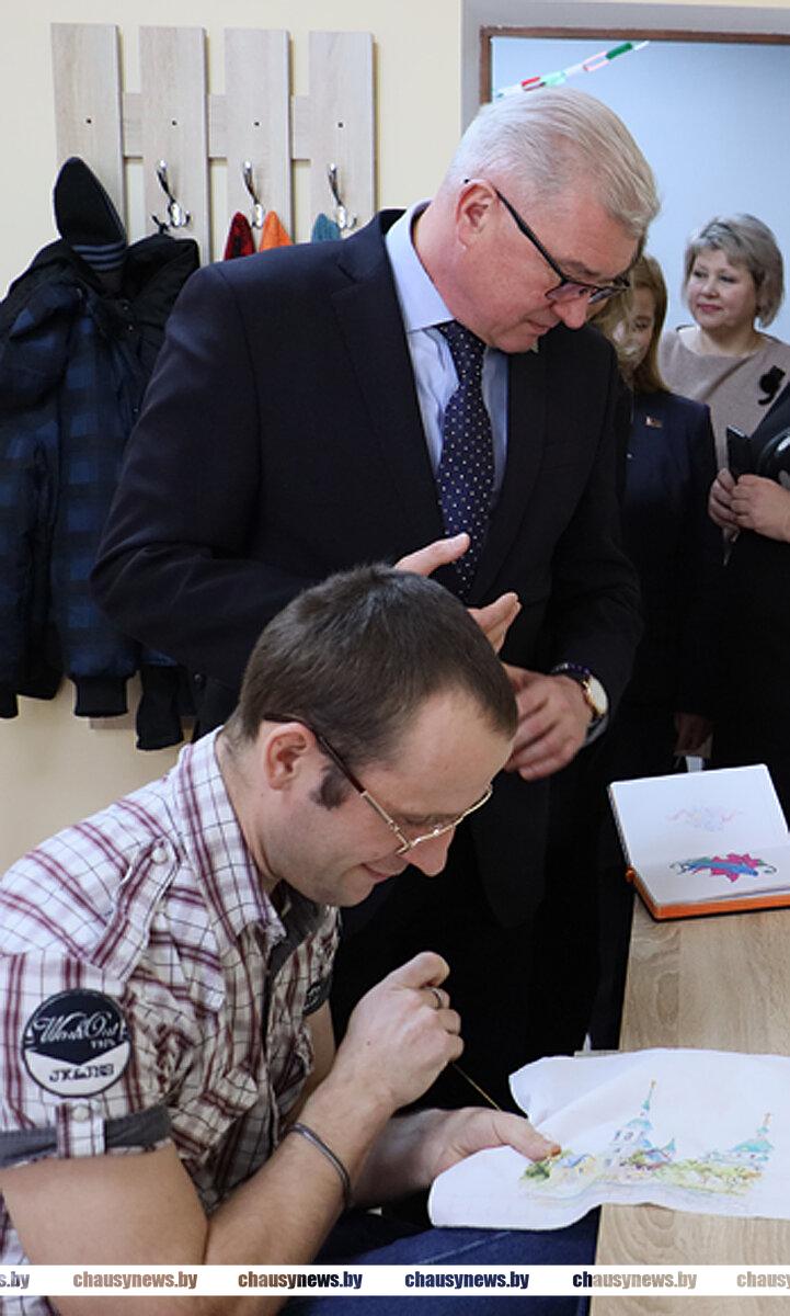 Валерий Анатольевич хорошо знаком с персоналом учреждения, часто бывал в гостях у проживающих. Они очень тепло встретили гостя, рассказали о своих увлечениях, достижениях, показали условия проживания, задали интересующие их вопросы, поблагодарили гостей за огромное количество подарков, вручили Валерию Малашко вышитую икону.