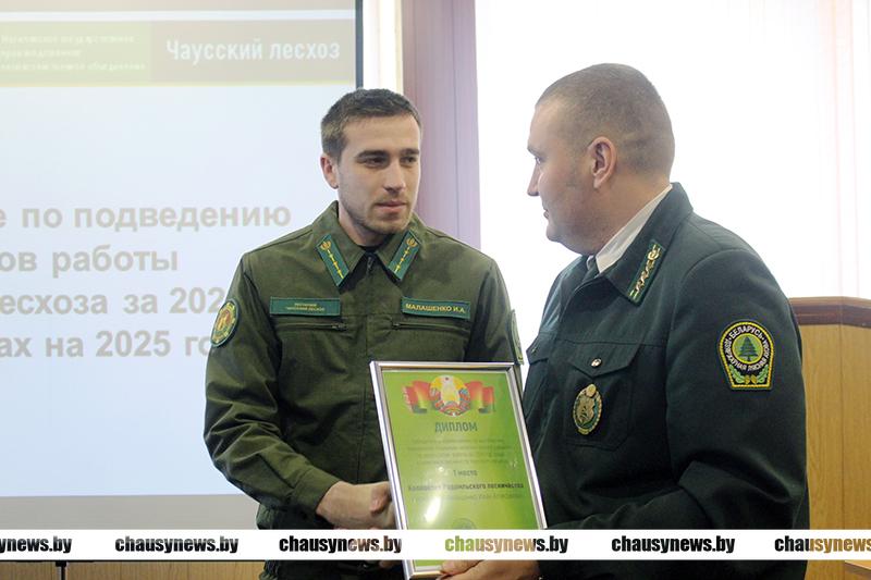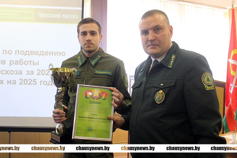 Затем были подведены итоги соревнования по выполнению показателей социально-экономического развития по результатам работы за 2024 год среди коллективов лесничеств Чаусского лесхоза. Третье место – у коллектива Сластёновского лесничества (лесничий Артур Кругликов), второе – у Мокрядского лесничества (мастер леса Вадим Бурдов). Первое же место и кубок заслужил коллектив Радомльского лесничества (лесничий Иван Малашенко).