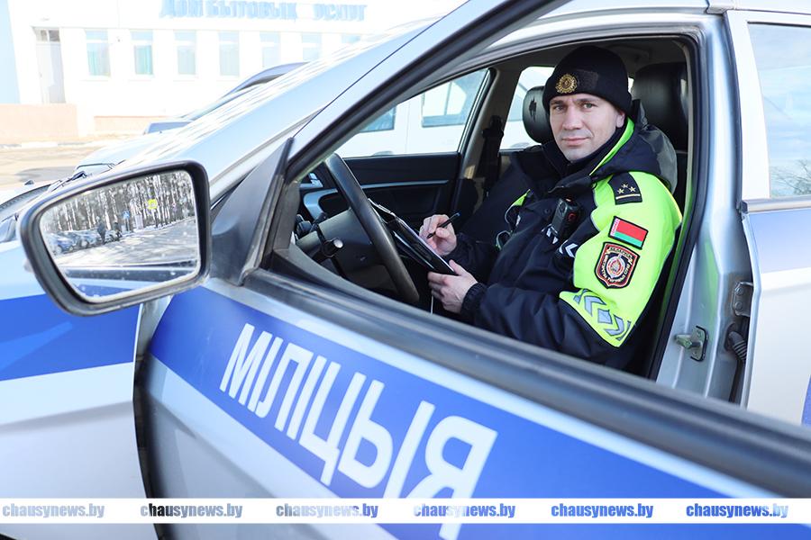 Инспектор ОГАИ Чаусского РОВД Максим Толпа стоит на страже дорог