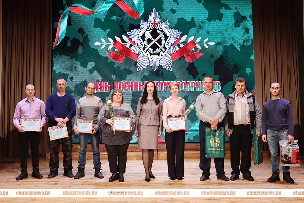 Благодарность районной организации «БСЖ» вручена начальнику секретной части Татьяне Гуринович, ведущему специалисту Алесе Кашпор. Ценный подарок от районного комитета общественного объединения «БРСМ» вручен начальнику группы призыва на военную службу лейтенанту Ивану Разумникову. Ценный подарок от Чаусского лесхоза вручили Максиму Воложанину.
