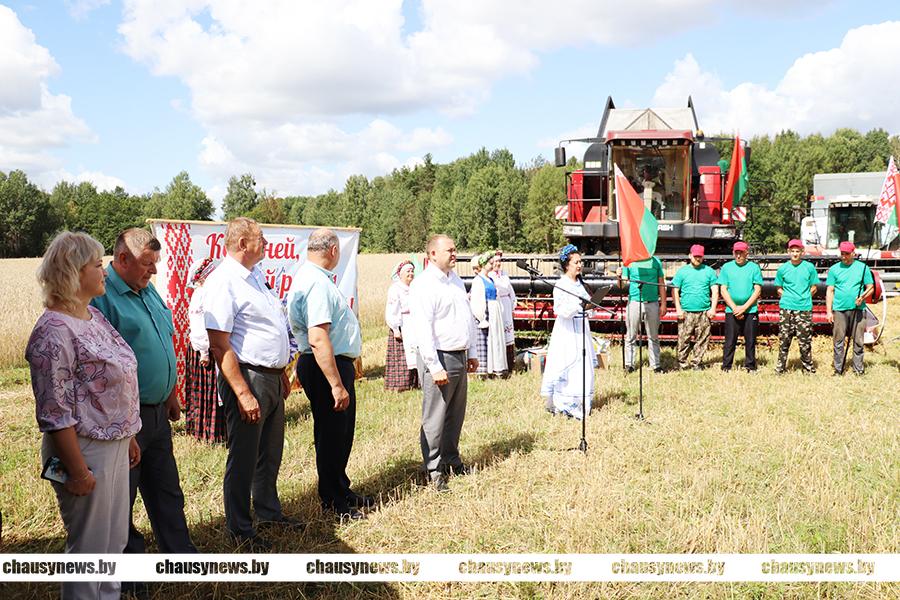 Прямо в поле они принимали поздравления от председателя Чаусского райисполкома Дмитрия Акулича, председателя районного Совета депутатов Анатолия Матюлина, председателя Могилёвской областной организации Белорусского профсоюза работников АПК Владимира Петровича и председателя Чаусского профсоюза работников АПК Светланы Рябцевой.