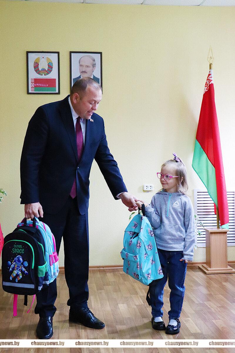 Дмитрий Михайлович пожелал детям учиться на одни «десятки», получать полезные знания, слушаться и любить своих родителей.  Председатель райисполкома лично надел на плечи первоклассников новенькие, яркие и красивые рюкзаки со всеми школьными принадлежностями. Были там и вкусняшки.