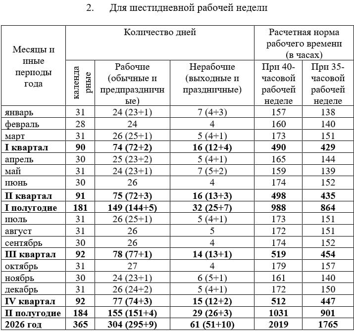 - 2019 часов – для шестидневной рабочей недели с выходным днем в воскресенье.