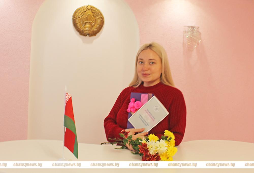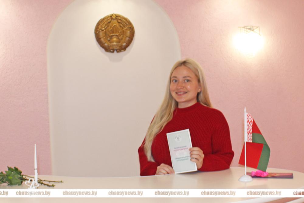 В Чаусах в День матери в отделе загса прошла торжественная регистрация рождения ребенка. Кристина Жданова получила свидетельство о рождении сына. Мальчика назвали Павлом.