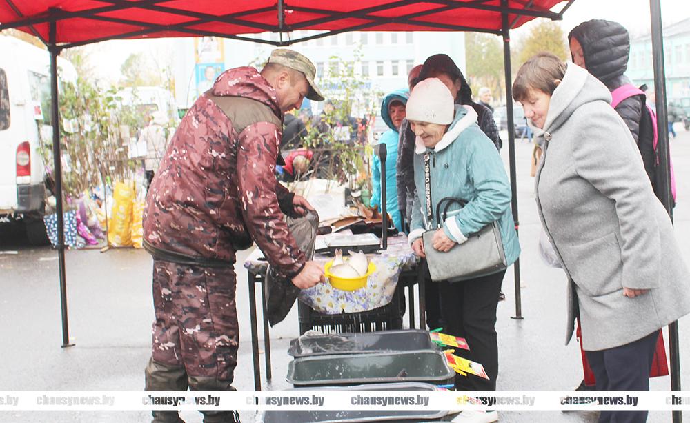 На городской площади Чаус 18 октября шумно и многолюдно. Жители и гости города, сельской местности спешат использовать отличную возможность сделать на зиму запасы овощей, прикупить саженцев и цветов для сада. Продают на ярмарке и многое другое.