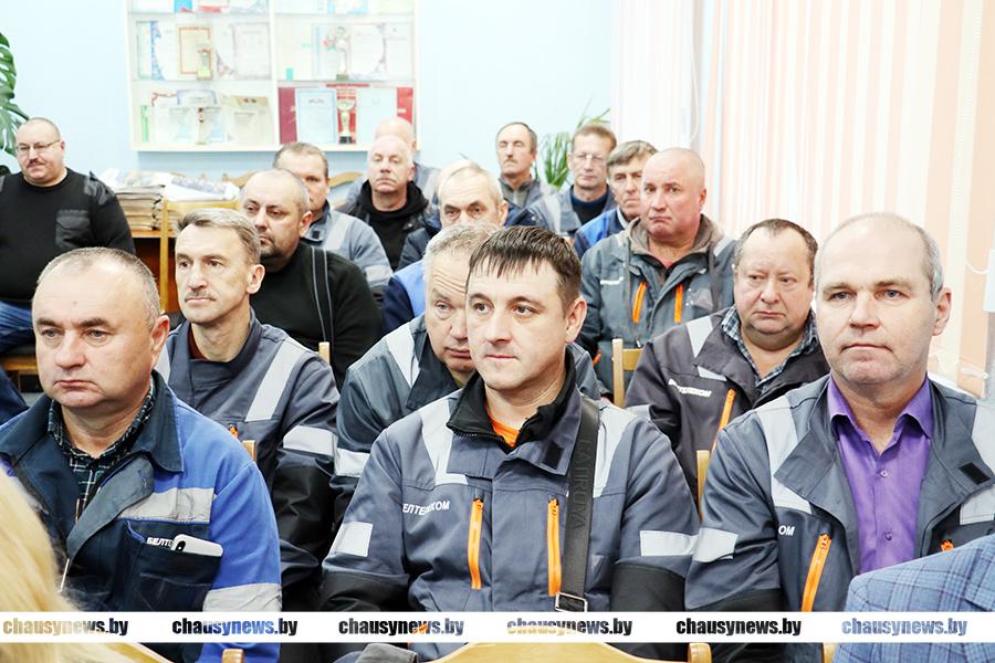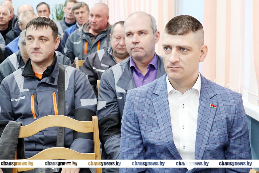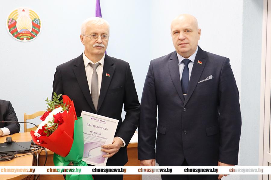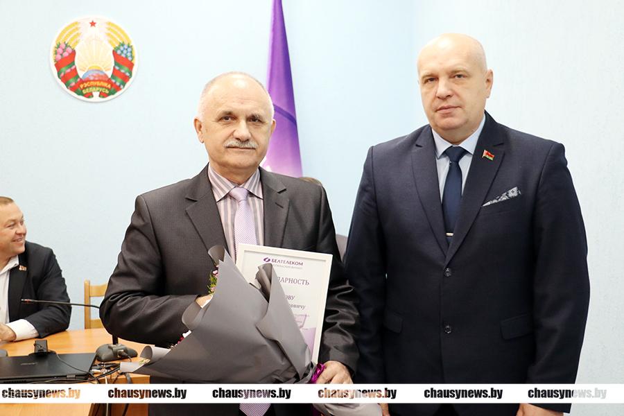 – Мы гордимся такими ответственными руководителями, которые умеют организовать работу коллектива, выполнять плановые показатели, добиваться высоких результатов. Ваш коллектив неоднократно был в числе победителей районного соревнования, что говорит о многом. Спасибо за достойный вклад в развитие региона, – подчеркнул Дмитрий Михайлович и вручил Почетную грамоту Чаусского райисполкома Николаю Валентиновичу. Председатель Чаусского районного Совета депутатов Анатолий Матюлин вручил ему и Почетную грамоту РСД. Анатолий Олегович вспомнил годы совместной работы, когда приходилось обеспечивать проводную телефонную связь, для коммуникаций между субъектами хозяйствования и контактов между людьми. Меняются технологии, сейчас оптоволоконные линии обеспечивают и телефонную связь, и интернет, и телевидение, а труд работников ЗУЭС все также востребован.