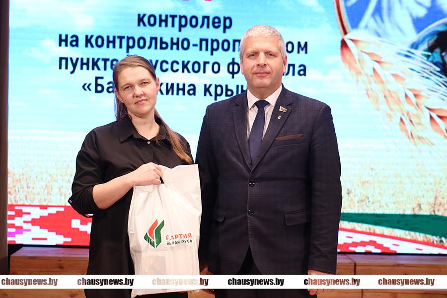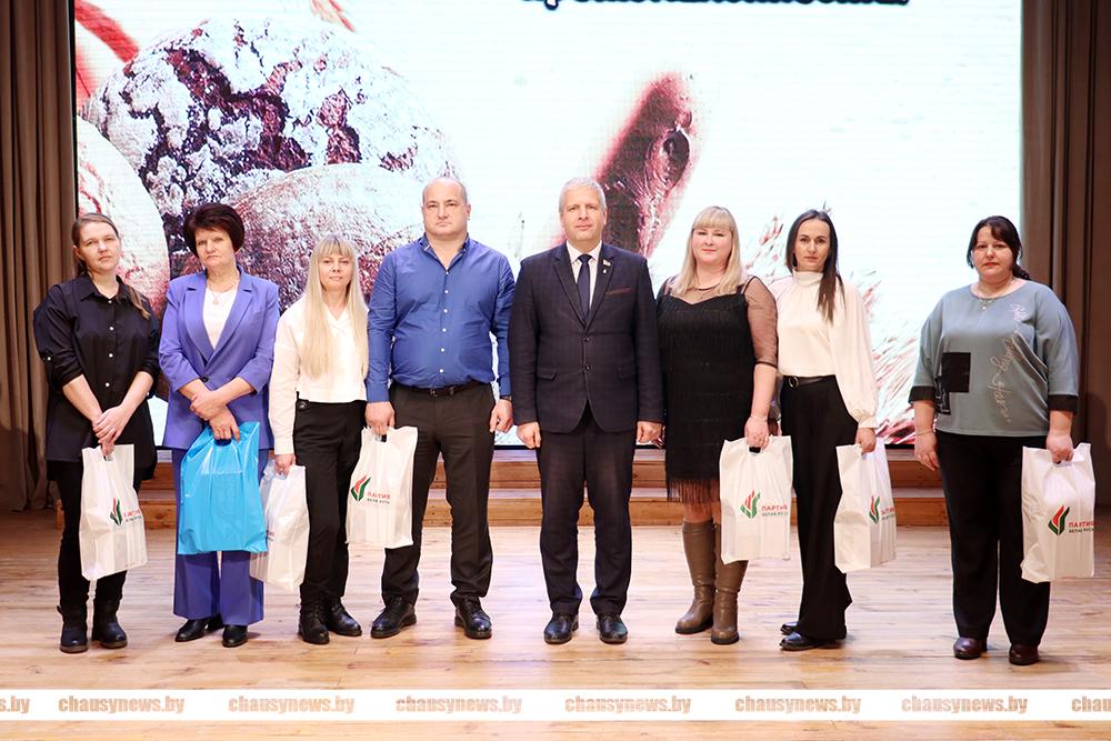 Заместитель председателя Чаусского райисполкома Андрей Верховодкин присоединился к поздравлениям и вручил подарки от районного отделения Белорусской политической партии «Белая Русь» Юлии Васильевой, контролёру на контрольно-пропускном пункте Чаусского филиала «Бабушкина крынка»; Вере Барановской, оператору машинного доения ОАО «Агросервис» г. Чаусы; Светлане Залого, кладовщику; Александру Пронину, ведущему инженеру-энергетику; Ирине Ракитской, уборщику помещений; Наталье Романовой, заведующему складом; Светлане Шароваровой, уборщику помещений Чаусского филиала ОАО «Бабушкина крынка».