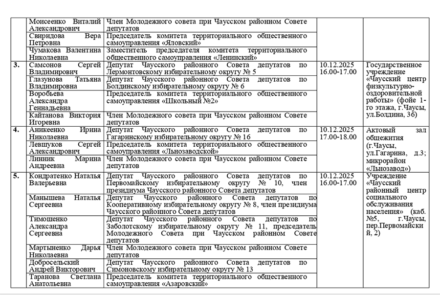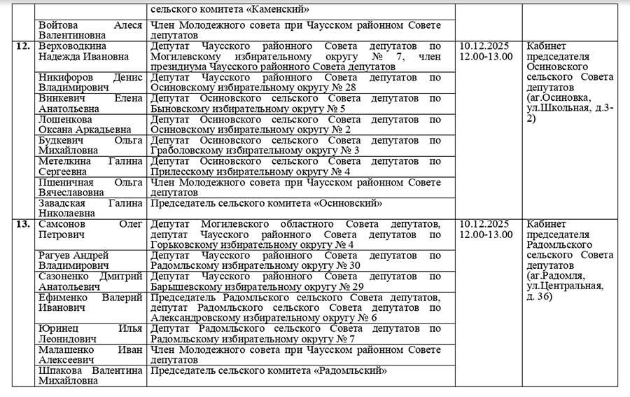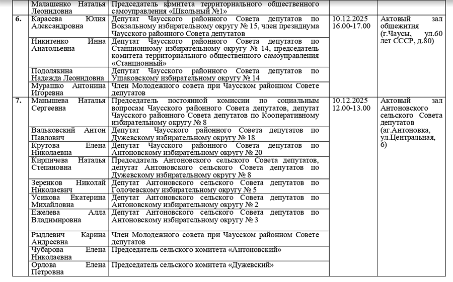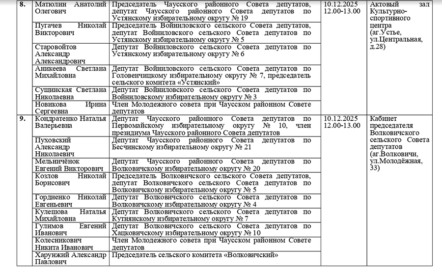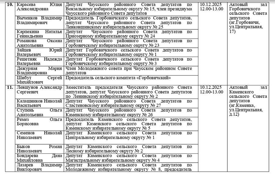 График проведения приема граждан и юридических лиц депутатами всех уровней 29 созыва Чаусского района в рамках единого дня приема 10 декабря2025г.