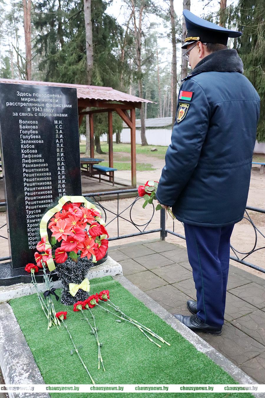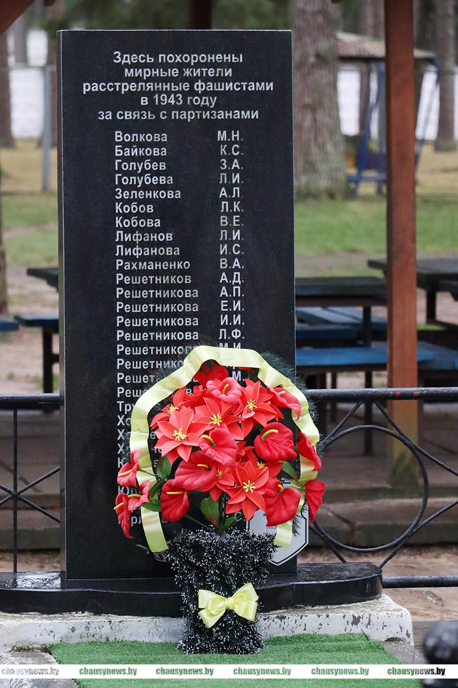 Мероприятие, посвящённое Дню памяти жертв преступления геноцида, прошло в Чаусах на территории социального пансионата «Росинка» с участием работников учреждения, представителей силовых ведомств. Здесь захоронены останки мирных жителей деревни Зелёный Прудок, расстрелянных карателями в мае 1943-го года.