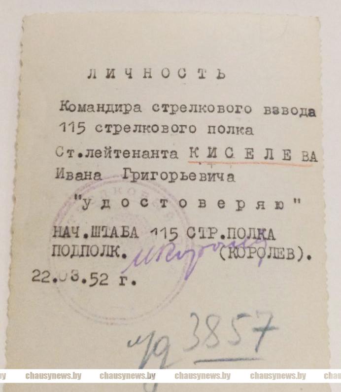 Прадедушка Елизаветы Васильченко – Иван Григорьевич Киселев  – родился 6 октября 1922 года в деревне Поповцы Чаусского района Могилевской области. В 1936-м году окончил 7 классов. С самого детства был приучен к тяжелому труду, его отец рано умер, нужно было помогать матери, она работала дояркой в колхозе.