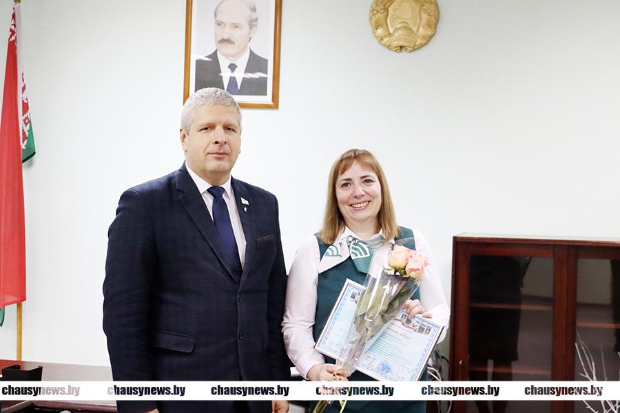 Андрей Владимирович вручил Благодарственный адрес Чаусского райисполкома управляющему операционной службой Центра банковских услуг №725 ОАО «АСБ Беларусбанк» Наталье Глушаковой.