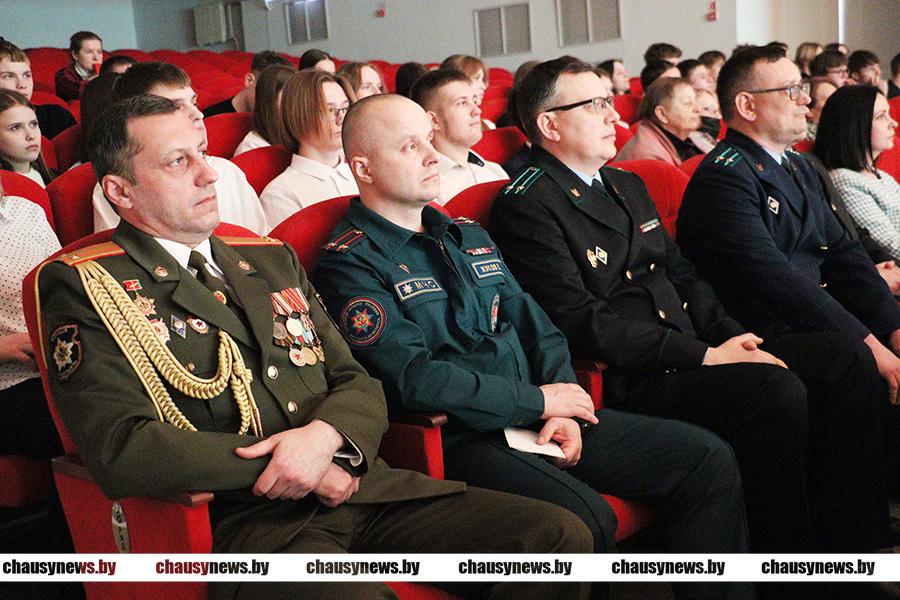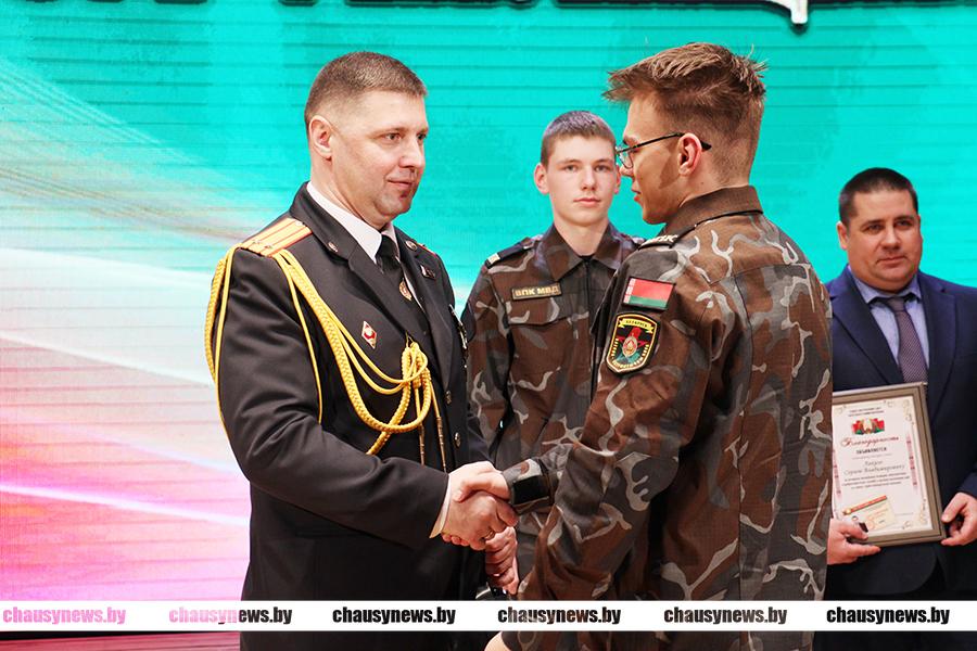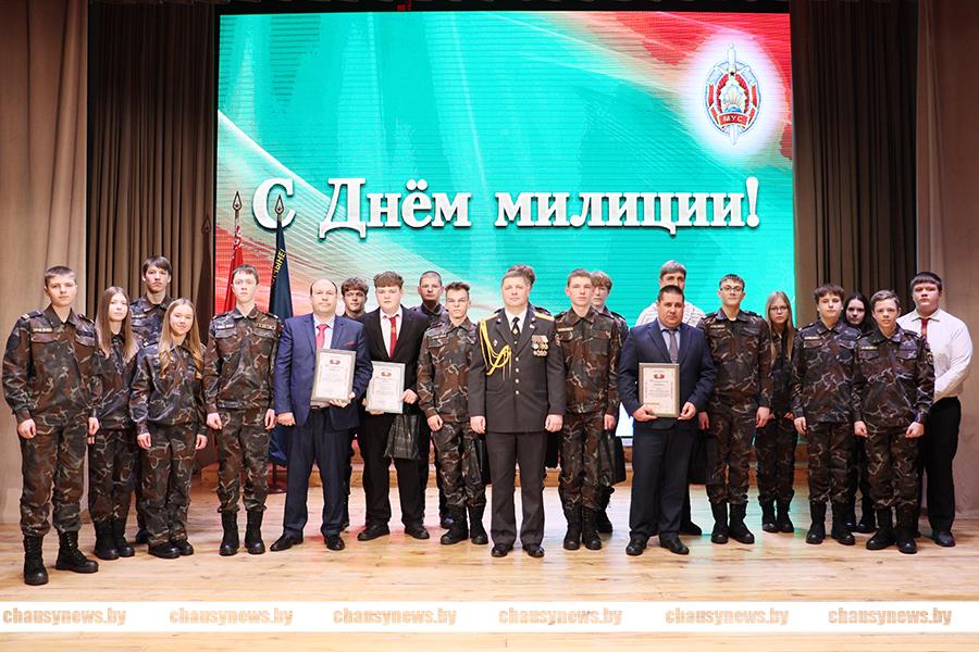 При поддержке Чаусского РОВД действует военно-патриотический клуб «Мужество» первой городской школы. Памятные сувениры вручены воспитанникам военно-патриотического клуба «Мужество» Глебу Болдовского, Кириллу Кравченко, Николаю Правошинскому, Данилу Сазонову, Максиму Синицыну, Станиславу Сипайло, Александру Черноруцкому.