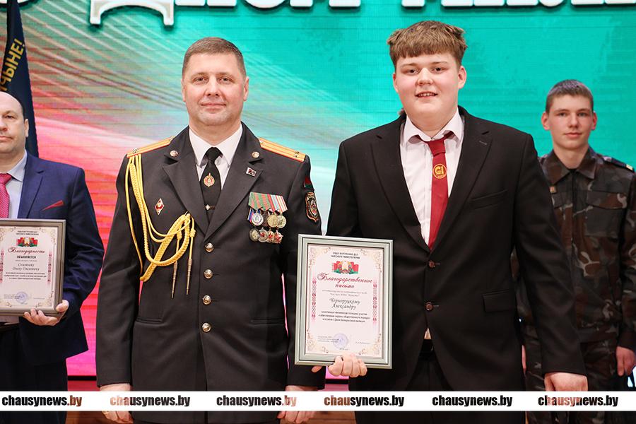 За активную жизненную позицию и участие в обеспечении Благодарственное письмо от Чаусского РОВД вручено руководителю по военно-патриотическому воспитанию средней школы №1 Антонине Ветер и воспитанникам клуба «Мужество» Александру Черноруцкому и Николаю Правошинскому.