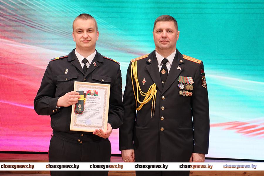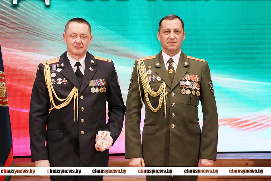 Игорь Тышкевич наградил юбилейной медалью «80 год вызвалення Беларусі ад нямецка-фашысцкіх захопнікоў» первого заместителя начальника Чаусского РОВД Николая Черноруцкого. Юбилейной медалью «100 лет вооружённым силам Республики Беларусь» награжден старший инспектор профилактики отделения охраны правопорядка и профилактики Михаил Русакович.