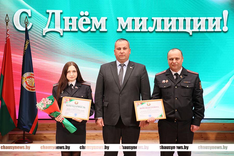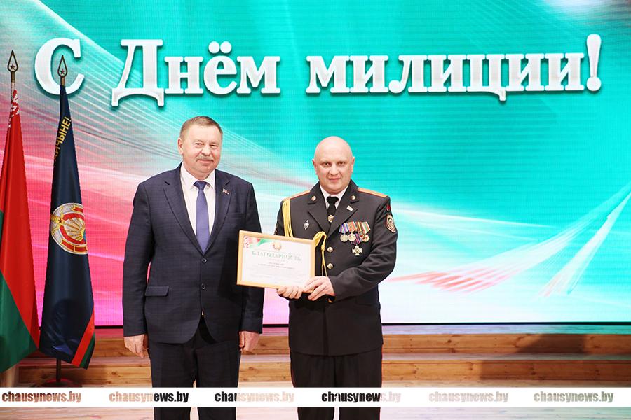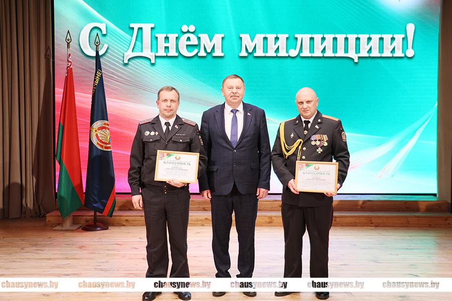 Председатель Чаусского районного Совета депутатов Анатолий Матюлин также отметил служение милиционеров во благо безопасности общества и вручил награды. Благодарность Чаусского районного Совета депутатов объявлена старшему госавтоинспектору Чаусского ОГАИ Александур Полевкову и начальнику уголовно-исполнительной инспекции Александру Гавронскому.