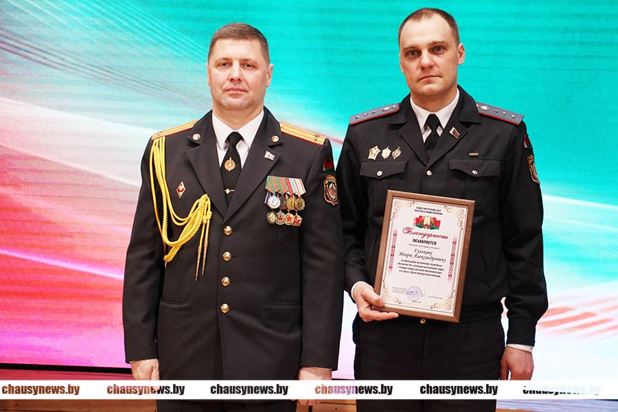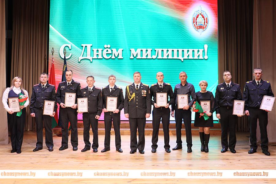 Продолжил церемонию награждения Дмитрий Рыбчинский. Благодарность начальника Чаусского РОВД объявлена старшему оперуполномоченному отделения уголовного розыска Юрию Муштукову; младшему участковому инспектору милиции Игорю Гулькову; старшему оперативному дежурному оперативно-дежурной службы Андрею Польских; помощнику дежурного оперативно-дежурной службы Даниилу Левшукову; милиционеру дежурному изолятора временного содержания Матвею Голубь; ведущему специалисту по регистру населения группы по гражданству и миграции Наталье Синявской; водителю автомобиля группы тылового обеспечения Дмитрию Шершнёву; уборщику помещений группы тылового обеспечения Татьяне Павленко; милиционеру водителю группы задержания группы милиции Чаусского отделения Департамента охраны Виталию Куропаткину; милиционеру водителю группы задержания группы милиции Чаусского отделения Департамента охраны Сергею Глатанкову.
