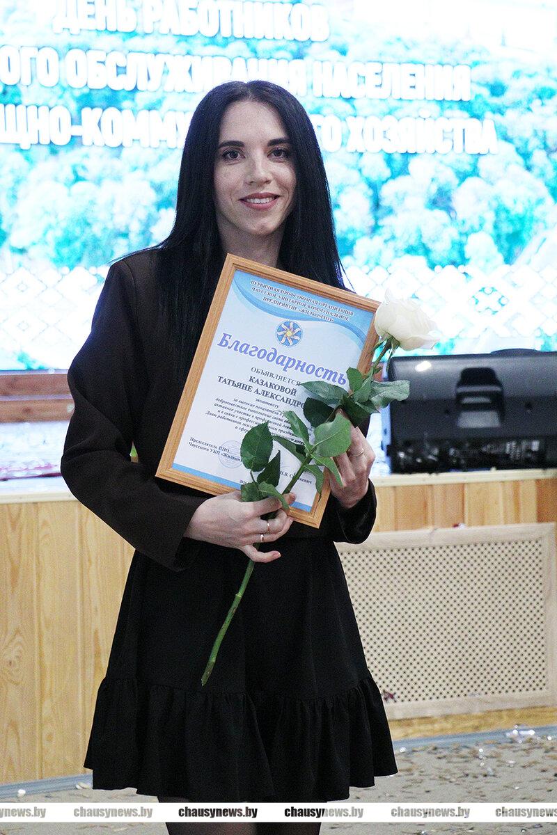 Заместитель председателя Чаусского райисполкома Ольга Кепина отметила большое значение сферы ЖКХ и бытового обслуживания населения для экономики региона, сказала теплые слова признательности работникам и ветеранам отрасли и продолжила церемонию награждения.