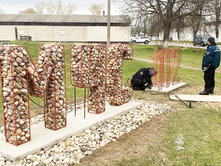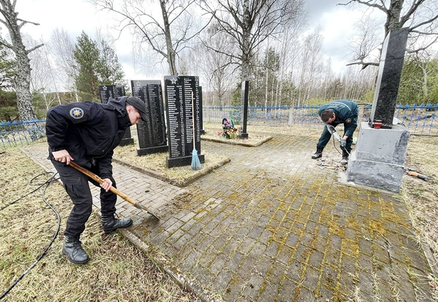 Работники Чаусского отделения Департамента охраны Министерства внутренних дел наводят порядок на памятном знаке в деревне Старая Буда.